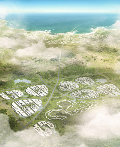 the project sits like a ring placed over the terrain, with its funnel-like roof forming a shaded perimeter walkway and an introverted core.