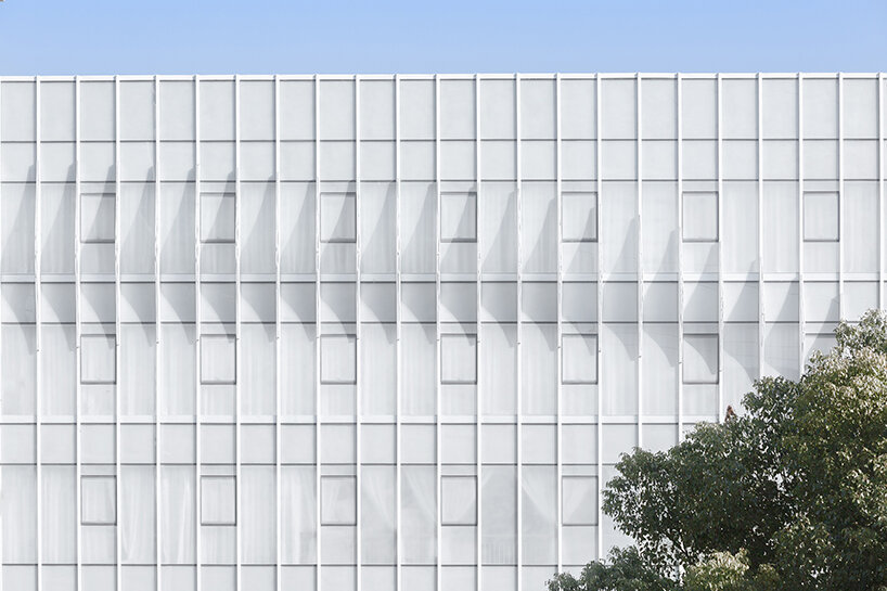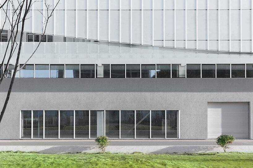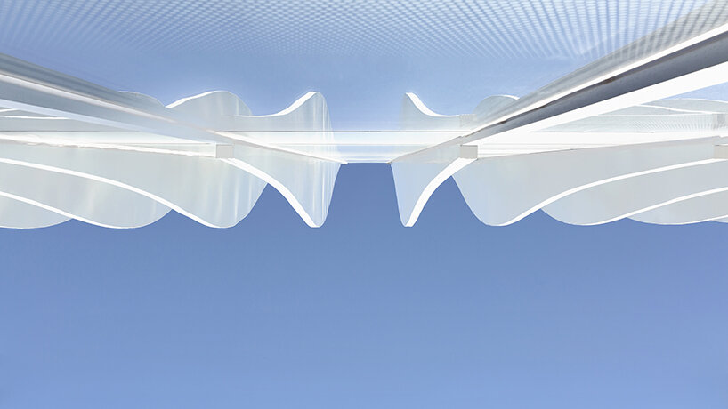 the project sits like a ring placed over the terrain, with its funnel-like roof forming a shaded perimeter walkway and an introverted core.