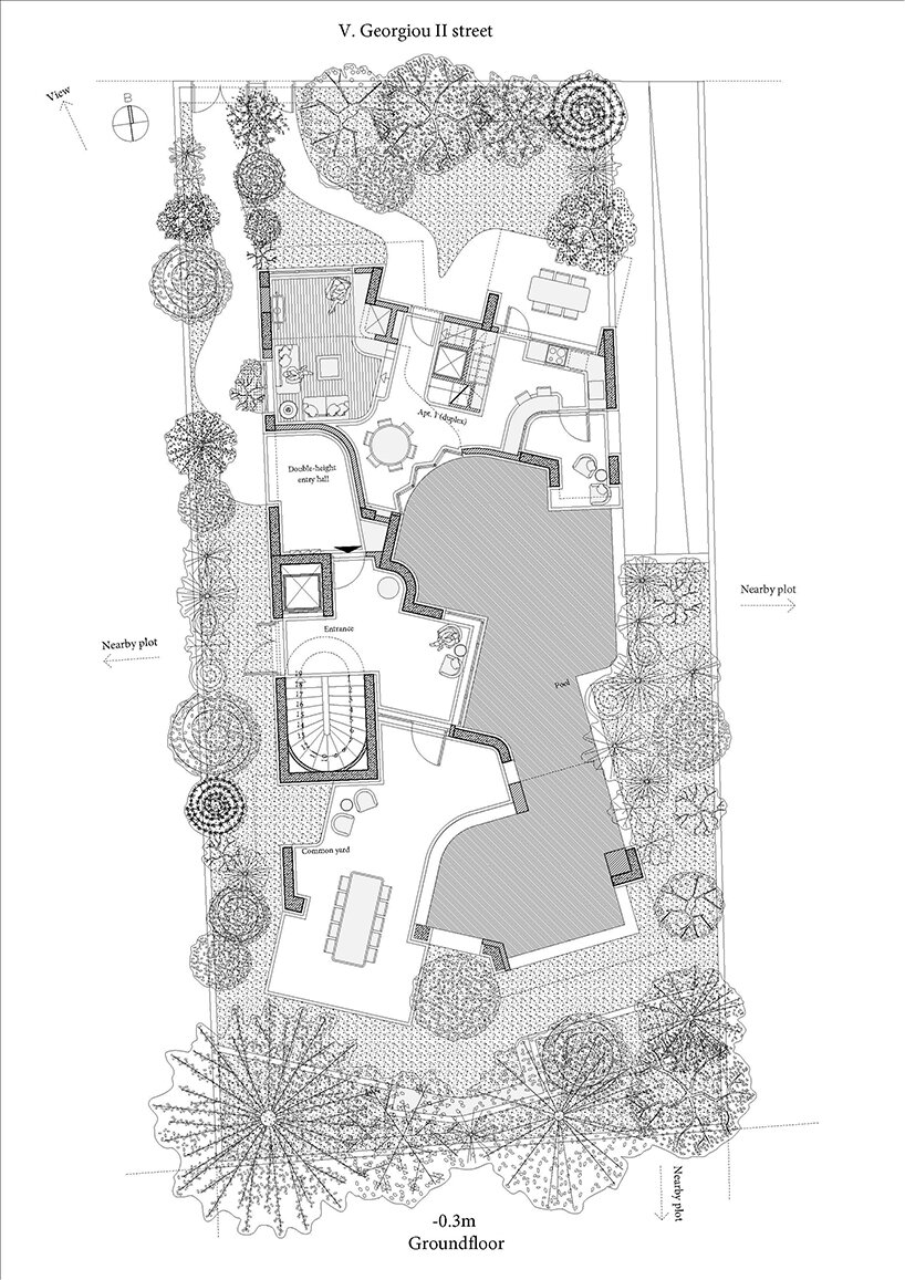 the project sits like a ring placed over the terrain, with its funnel-like roof forming a shaded perimeter walkway and an introverted core.
