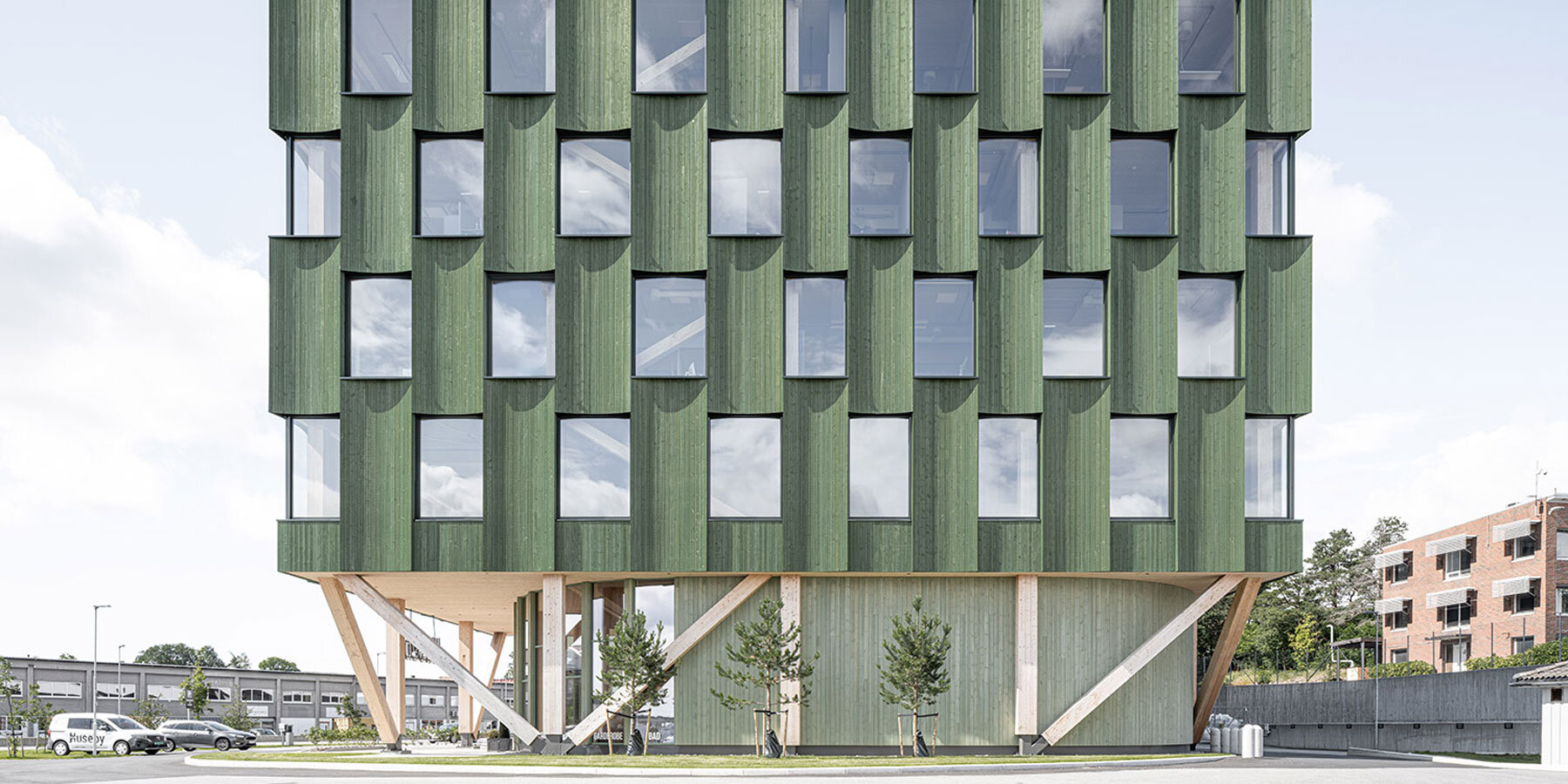 green timber curves sculpt rhythmic facade for office building in norway