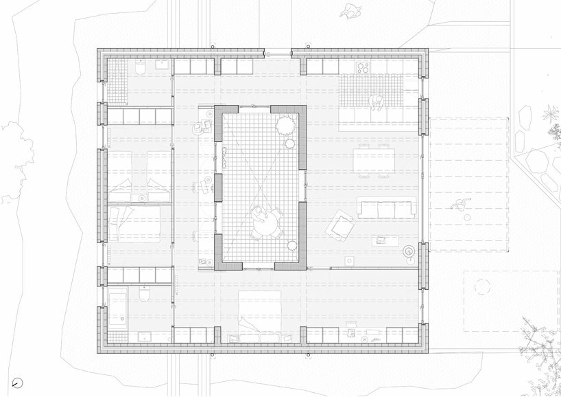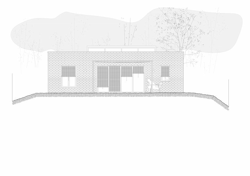 Simultaneously, the project was designed to operate with zero consumption and high health standards through bioclimatic strategies. To achieve this brief, the structure takes shape as a brick box that is punctured by a greenhouse-like patio that splits the dwelling into two main sections: The southern area accommodates the common spaces, while the northern semi-buried unit contains the sleeping rooms and bathrooms.greenhouse-like patio punctures slow studio's passive house in ametlla