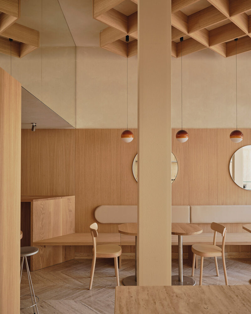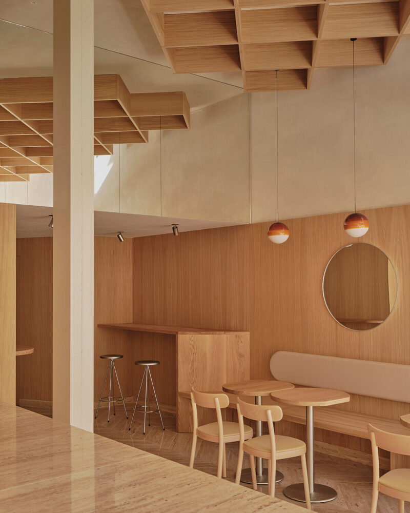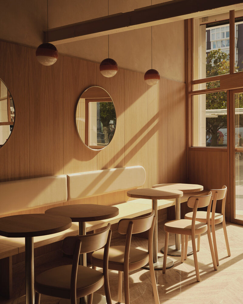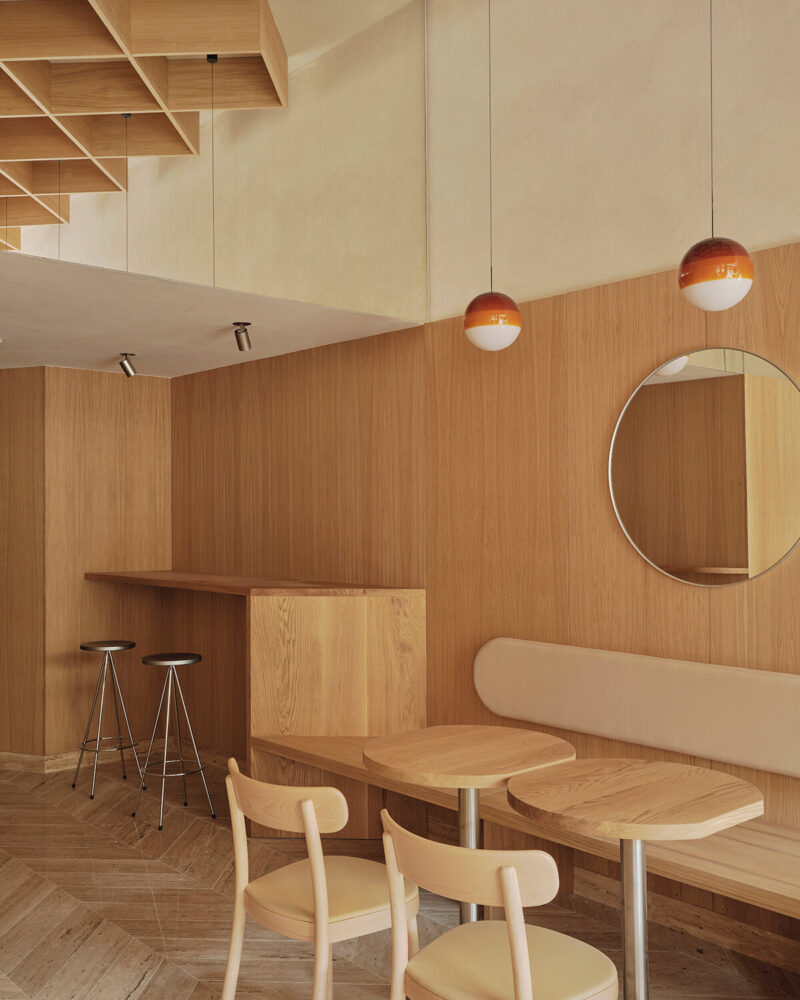 circular mirrors and globe pendants are visual references to ice cream scoops