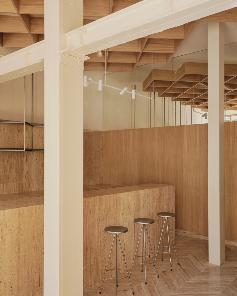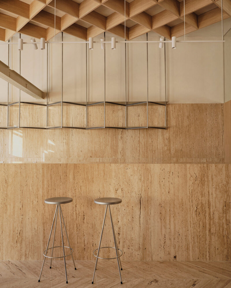 the project sits like a ring placed over the terrain, with its funnel-like roof forming a shaded perimeter walkway and an introverted core.