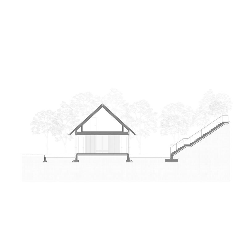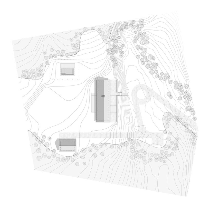 the project sits like a ring placed over the terrain, with its funnel-like roof forming a shaded perimeter walkway and an introverted core.