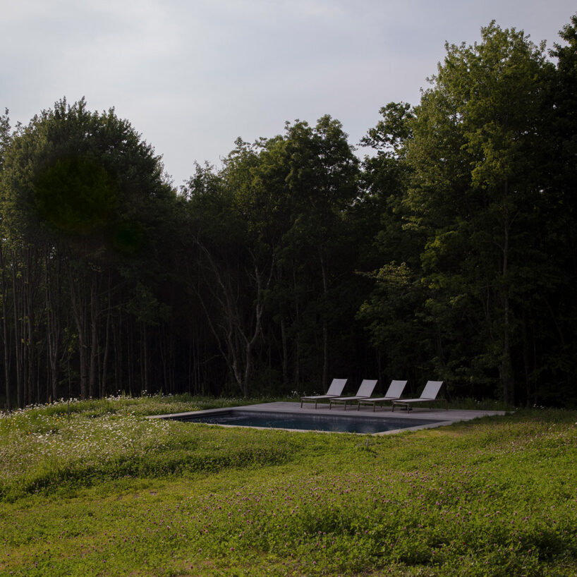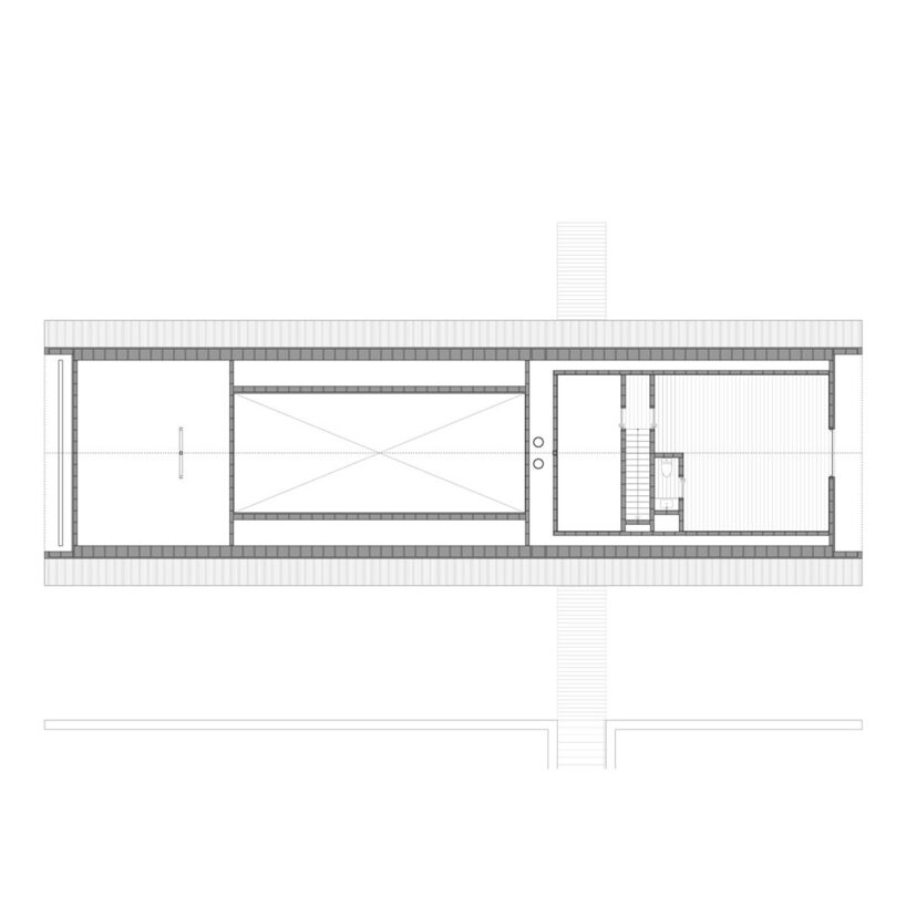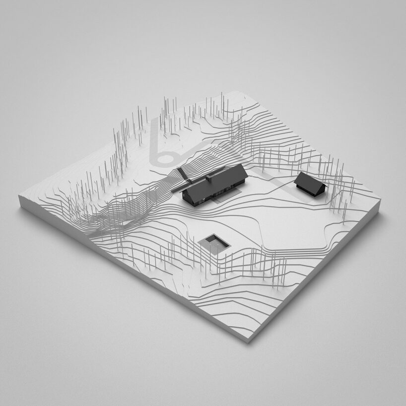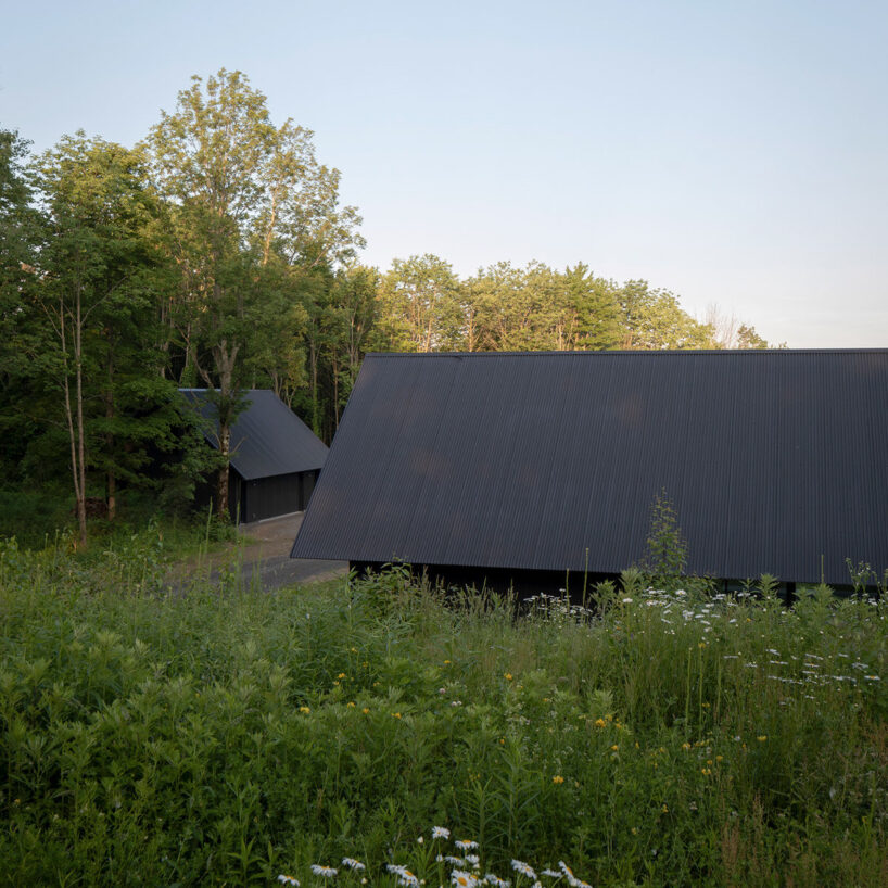 the home and guest house feature black corrugated metal exteriors with subtle textures