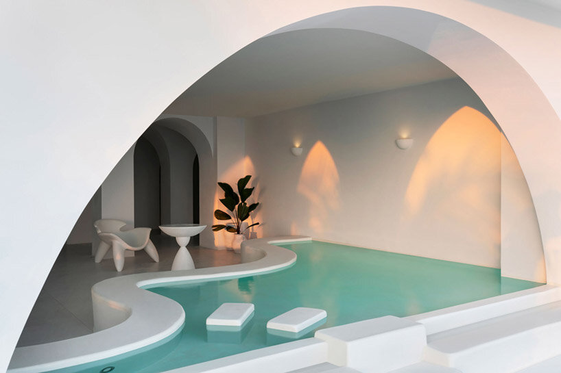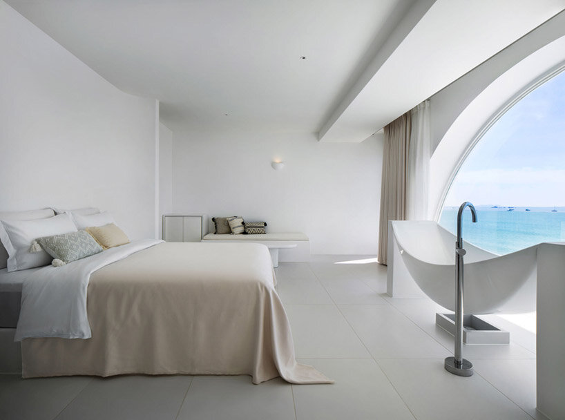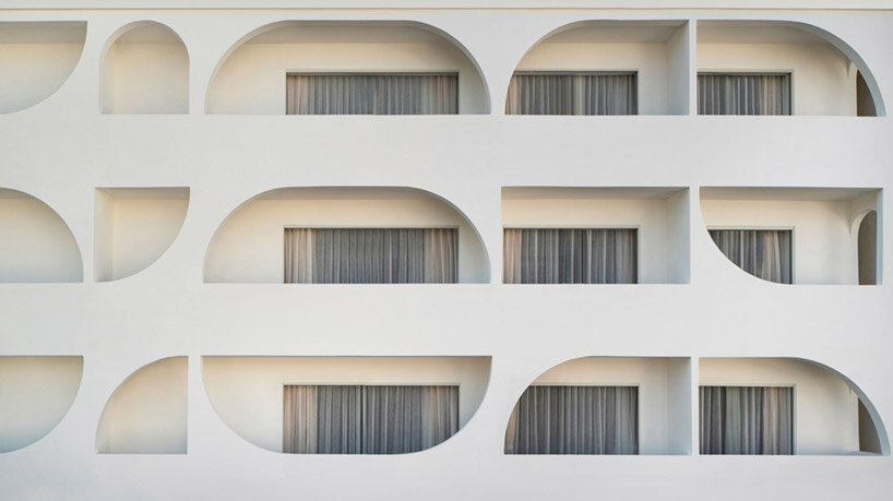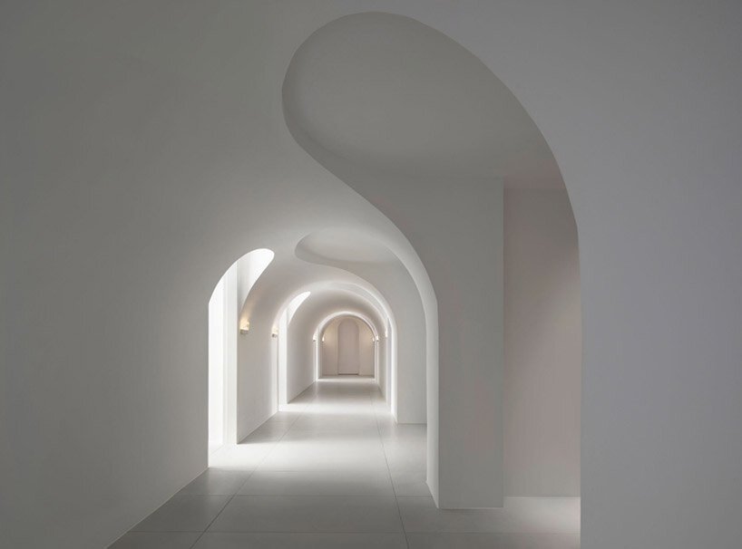 the project sits like a ring placed over the terrain, with its funnel-like roof forming a shaded perimeter walkway and an introverted core.