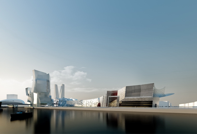 the project sits like a ring placed over the terrain, with its funnel-like roof forming a shaded perimeter walkway and an introverted core.