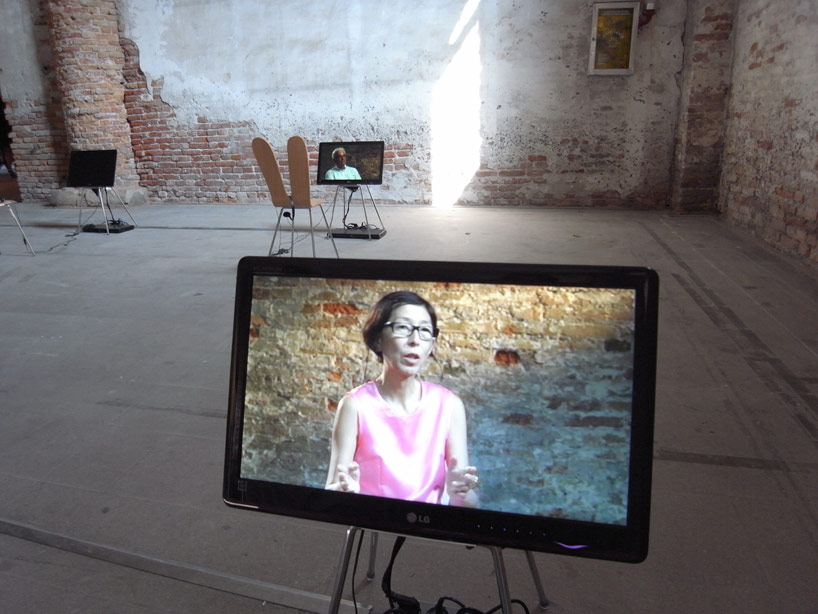(upper left) exhibition view (upper right) ryue nishizama and kazuyo sejima of SANAA (bottom left and right) participants listening to the interviews on headphones images © designboom