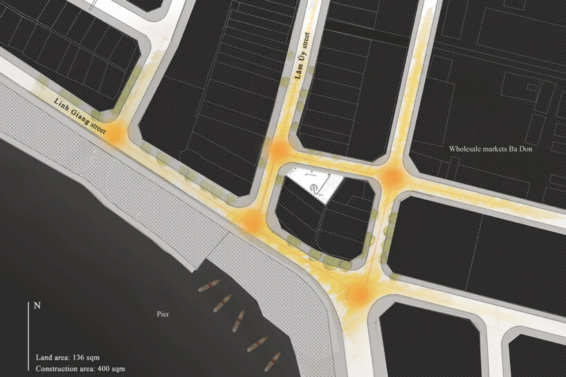 H.BD Atelier’s Nam House sits amidst the vibrant chaos of Ba Don Town, Quảng Bình, Vietnam. The region is known for its dramatic landscapes, harsh climate, and fast-pace culture. The architects, keeping these elements in mind, have designed a unique home that offers a refuge from the external noise while remaining connected to nature. Quang Binh’s narrow land and harsh climate heavily influence the way people live. The home is located at a busy intersection, with a wholesale market in the front and a riverbank with waterway trade at the back. Given the limited plot size of 136 square meters, the architects designed a thoughtful solution. The ground floor remains open with large glass facades on two sides suited for commercial activities. This caters to the homeowner’s needs while engaging with the commercial area.