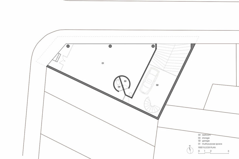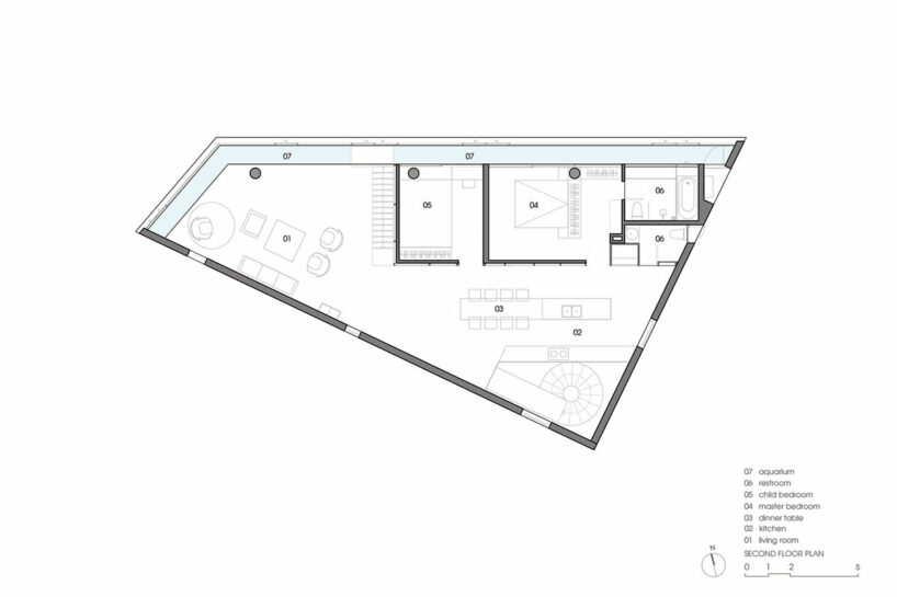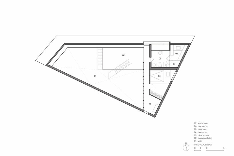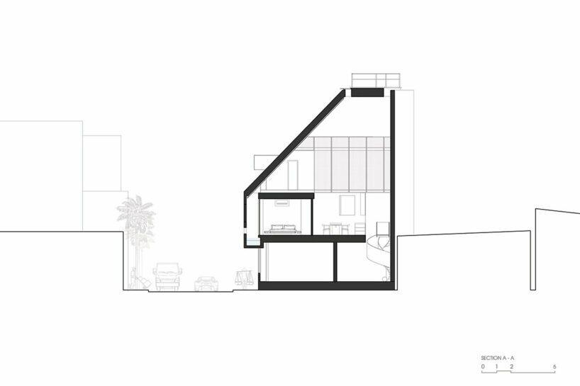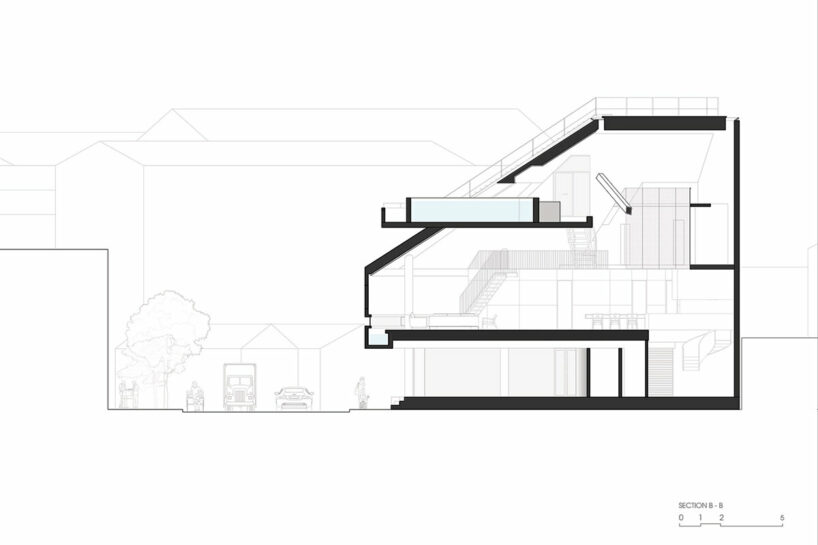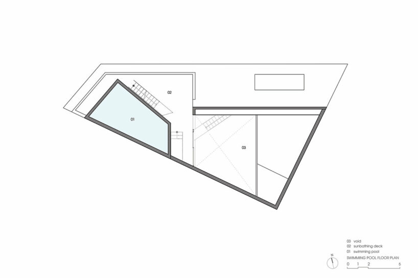 The team achieved a sense of continuity by alternating closed and open spaces on the different floors. The slanted roof evokes a mountainside, providing a view of the calming sky while ensuring privacy from the city. Topping the home is a half-roofed, half-open swimming pool on the west side. This unique design allows for an immersive swimming space. Meanwhile, the long staircase leading to this rooftop creates a sense of anticipation and reward, culminating in a panoramic view of the surroundings.