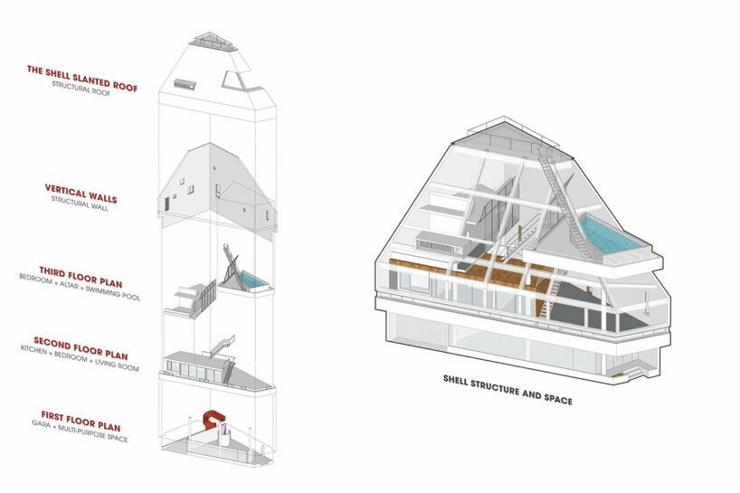 the slanted roof is designed to resemble a mountainside, with its half-roofed, half-open swimming pool