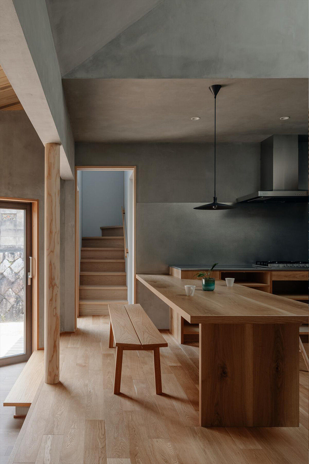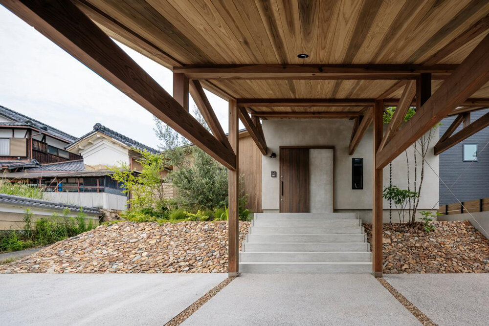 wooden accents are combined with concrete surfaces