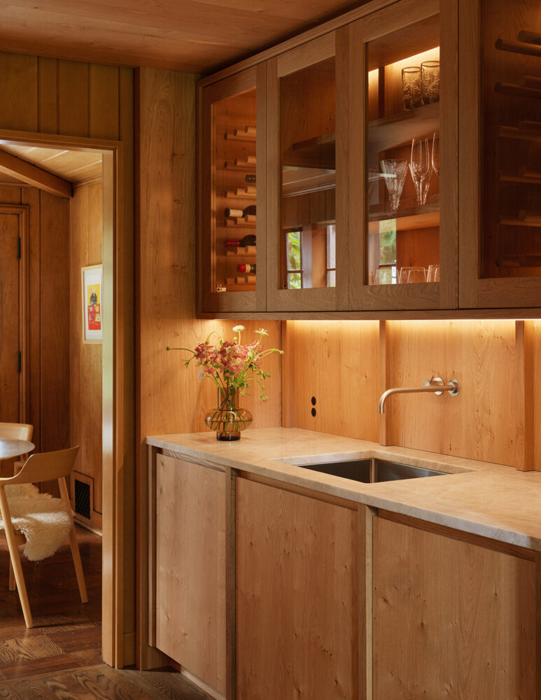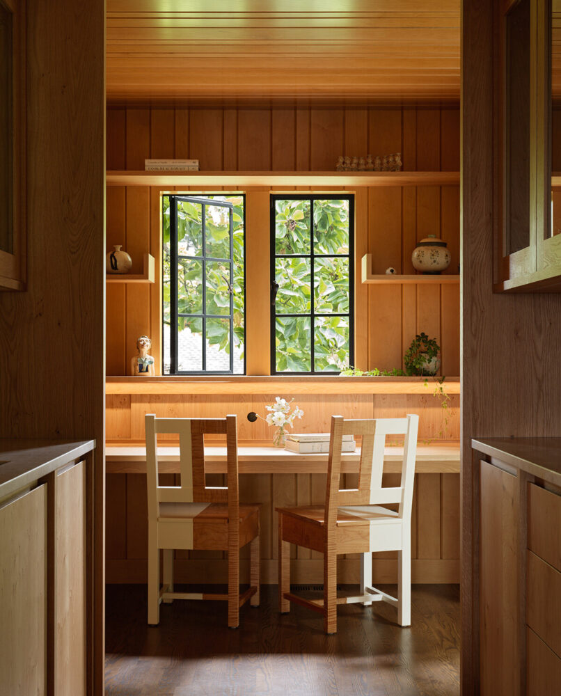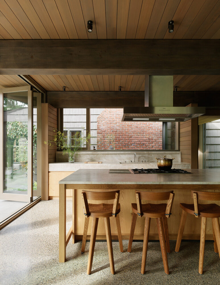 wood ceilings and heavy timbers extend from the interior to the exterior
