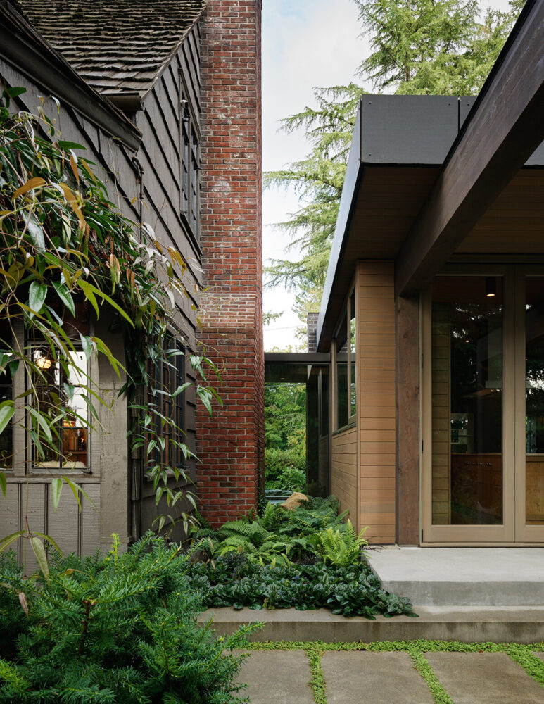 heavy timber post-and-beam construction with brick and stained wood finishes harmonizes with the original home