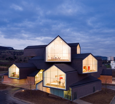 the concept of the ‘vitrahaus’ connects two themes which are occurring in the architectural practice of herzog & de meuron: the theme of the archetypal house and that of stacked volumes. the five-storey structure is comprised of 12 ‘houses’ – five houses are set at the base in which seven other houses are stacked upon one another. each of the structural volumes appear as if they have been shaped by an extrusion press and are cantilevered up to 15 meters in some places. the floor slabs intersect the underlying gables, resulting in a three-dimensional assemblage or ‘pile of houses’.