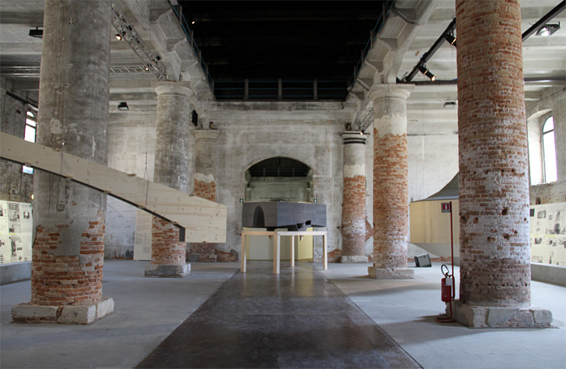 herzog & de meuron 13th international architecture exhibition view through the plaza – surface of table represents the top of the former warehouse in which the new structure rests upon image © designboom