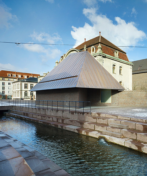 ‘between the two museum complexes, unterlinden square has recovered its historical significance, recalling the times when, across from the convent, stables and farm buildings formed an ensemble known as the ‘ackerhof’. the bus stop and parking lot existing prior to the museum’s renovation have now become a new public and urban space. the sinn canal, which flows under colmar’s old town, has been reopened, becoming the central element of this new public space. close to the water, a small house marks the museum’s presence on the square: its positioning, volume and shape are those of the mill that once stood there. two windows allow passers-by to look downwards at the underground gallery connecting the two ensembles of buildings.’