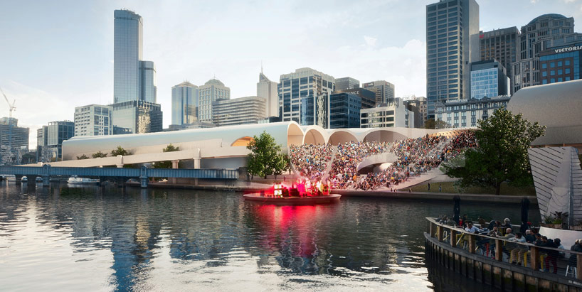 herzog and de meuron in conjunction with HASSELL have proposed a vaulted network for the AUD $1 million flinders street station design competition. the gestalt of the architecture is the repetition of lattice-like vaults that fracture light over the reorganized interior concourse. the brief called for the preservation of the historical station building; a requirement met by the introduction of dynamic and considered circulation throughout the site. the existing interior spaces, which are mostly closed from public usage, will be re-opened, through the incorporation of various cafes, bars, retail and services. the strong architectural identity of the historic building remains intact with the interior ballroom, gymnasium, and adjacent rooms of the administration building re-appropriated for melbourne festivals. the scheme’s grand civic gesture is a large plaza and amphitheater opening the station to the river’s edge – providing seating, performance and event life. the pedestrian entrances along this facade also help to break the linearity of the site. the new proposal gives the city of melbourne a place-making cultural facility with a world class gallery for oceanic and contemporary art. the banana alley vaults – originally conceived as a market storage space for local produce – reconnect the western and southern end to the main station plaza, with key pedestrian transit routes. see the full shortlist of the flinders street station design competition, which includes proposals by zaha hadid and grimshaw architects, on designboom here.