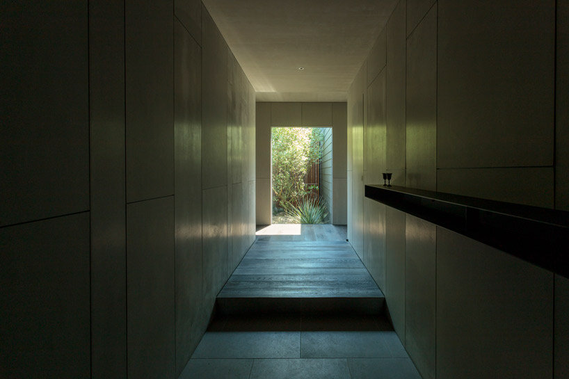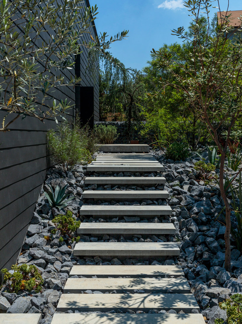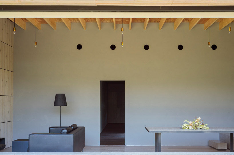 the project sits like a ring placed over the terrain, with its funnel-like roof forming a shaded perimeter walkway and an introverted core.