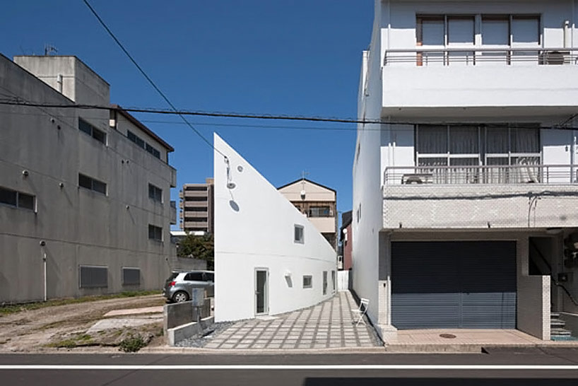 the ‘Y house’ in hiroshima japan is designed by hideyuki nakayama architects and has been introduced by JA+U (Japan Architecture+Urbanism. a white exterior wall curves down the length of this narrow lot, creating a color-coordinated relationship with its neighbor. the 95 square meter dwelling was conceived as both a ‘gray cliff’ and ‘white valley’, using a windowless exposed concrete facade to overlook the bordering empty lot. a roof slopes downwards towards the driveway, introducing daylight reflecting from the adjacent three-storey tall building through skylights. the indirect illumination within the upper level creates an attic-like atmosphere for the bedrooms.