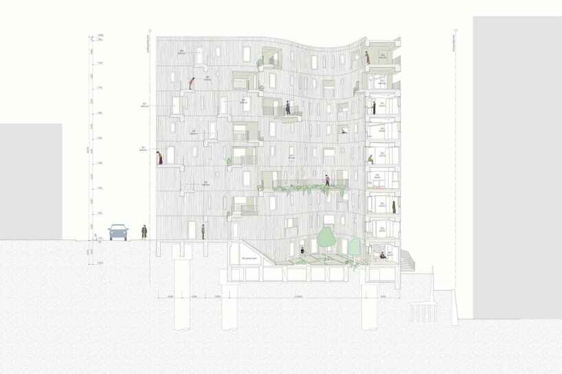 Next, the design incorporates side openings facing the courtyard, creating balconies for both residences and common areas. These openings allow light and air to enter the space from multiple directions. Finally, the team employed a unique textural treatment for the 30-meter (98-foot) high courtyard walls. By using unconventional materials for the formwork, they aimed to achieve a linear yet irregular appearance that enhances the perception of even the slightest light filtering into the space. The courtyard is designed with the potential for engagement with the public, with uses including a co-working area, a cafe, or a market.