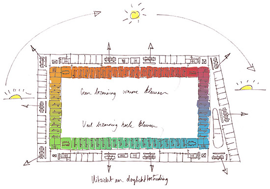 meeting roomeach of these four corners of the building has a colour which is based on the movement of the sun. the warmer, sunny areas are compensated with blue and green, while the cooler, shaded areas have been enhanced with vivid colours like red and orange. due to the sun orientation, the warm colours are located on the north side of the building, and the cold colours are on the south side.