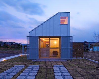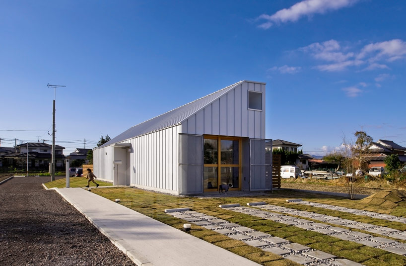 complete with dog grooming salon, this multipurpose house by japanese firm naoko horibe architect’s office, cleverly integrates both business and living functions into the one building. located in usa-shi, oita in japan, the 66.25m2 building sits on a narrow plot of land surrounded by rice fields. the house’s business activity is adjacent to the main road and accessed directly from the street, at the other end are the family’s living quarters. separating the two functions – family home and dog salon – is the bathroom and kitchen, conveniently located in the middle of the volume, so they can easily be used from both ends. constructed from wood with a mono pitch roof, the open plan interior has extended views out to the garden, making the building feel larger than it really is. curtains are used to draw privacy between the different living spaces and provide distinction between the working and family areas. a small mezzanine level faces the exterior courtyard, with a daybed for the the occupants to relax on.