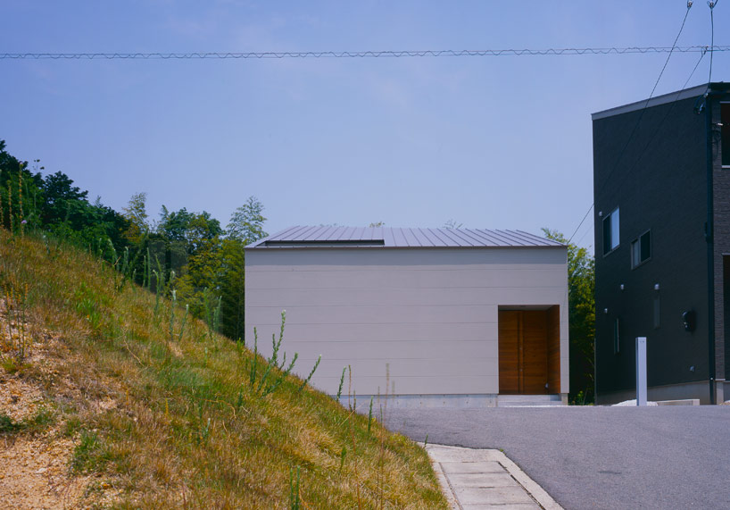 concealed from its surrounding neighbors, this design by japanese firm horibe associates offers a high level of privacy, while still achieving a sense of light and openness from the inside. located on a street in japan lined uniformly with houses along it, ‘house in kamihachiman’ is orientated towards a bamboo forest on its northern side. the building’s angular-shaped roof slants upwards, allowing large double-height windows to frame the natural landscape. vast amounts of daylight filter through into the interior, helping to connect the open-plan living and dining spaces to the outside. carefully crafted details in a simple palette of wooden materials with white painted finishes help the built-in furniture become part of the overall architecture. abstracted voids on both sides of the house increase the volume’s sense of openness, while peeking down from the upstairs room, a recessed window looks onto to the dining area below and beyond to the exterior landscape. an enclosed outdoor terrace is attached to the living room, giving the occupants a private indoor-outdoor area, which adds to the building’s sense of lightness.