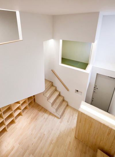 (left) stairs to bedrooms (right) view from stairway images © eiji tomita