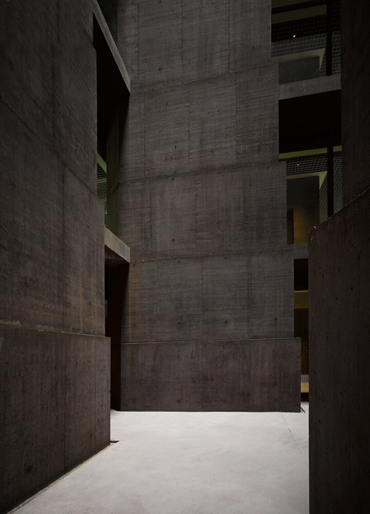 on the ground floor, robust walls conceal the foyer, which is not visible from the outside. here, one enters the building from the street, the light comes from above and the atmosphere is calm.  on the upper levels, there is a series of open office spaces adopting a much more extroverted character than the one in the foyer. the working areas are completed with horizontal references to the other floors and the surrounding area. ‘everything here can be experienced in its entirety and one works together on open and bright balconies over street level,’ the swiss architect shares. reocurring house-shaped elements articulate concrete office tower by valerio olgiati in switzerland