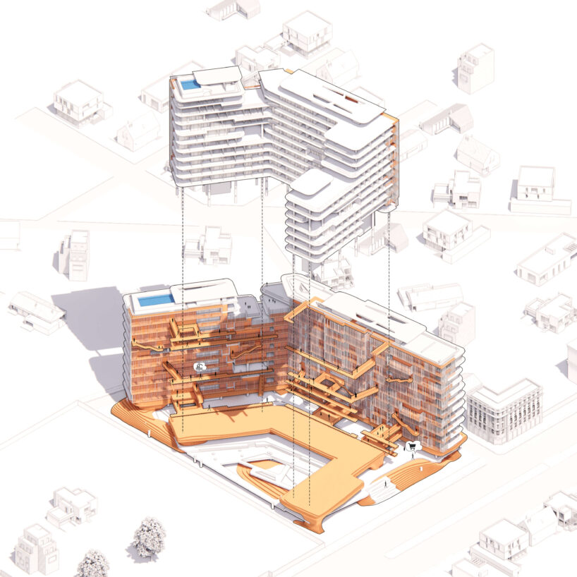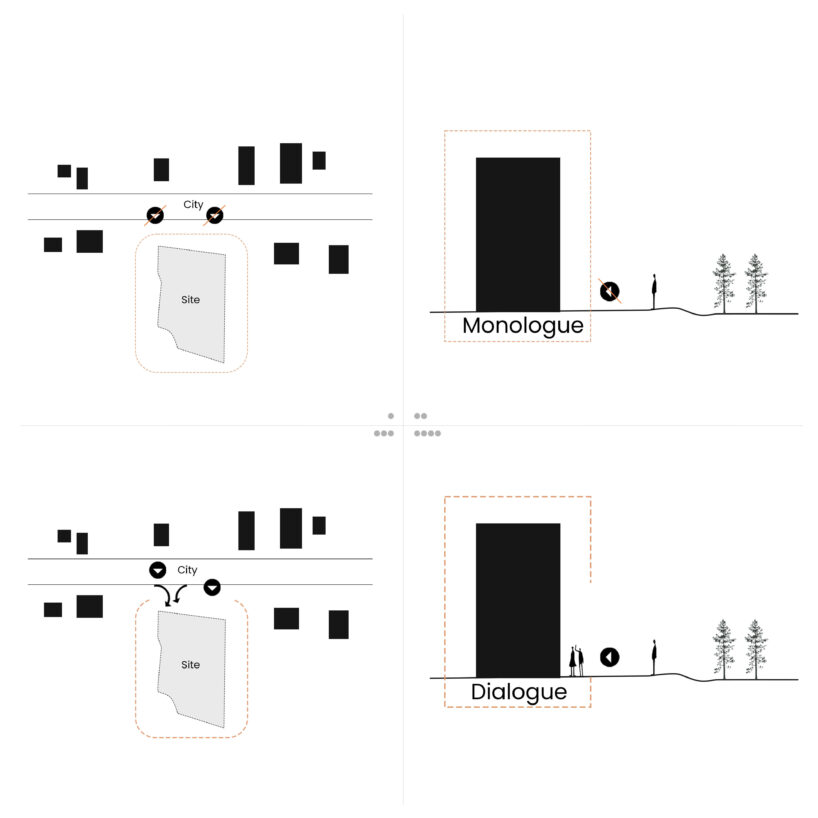 the building’s mass expands towards the main boulevard, creating a dynamic relationship with the city