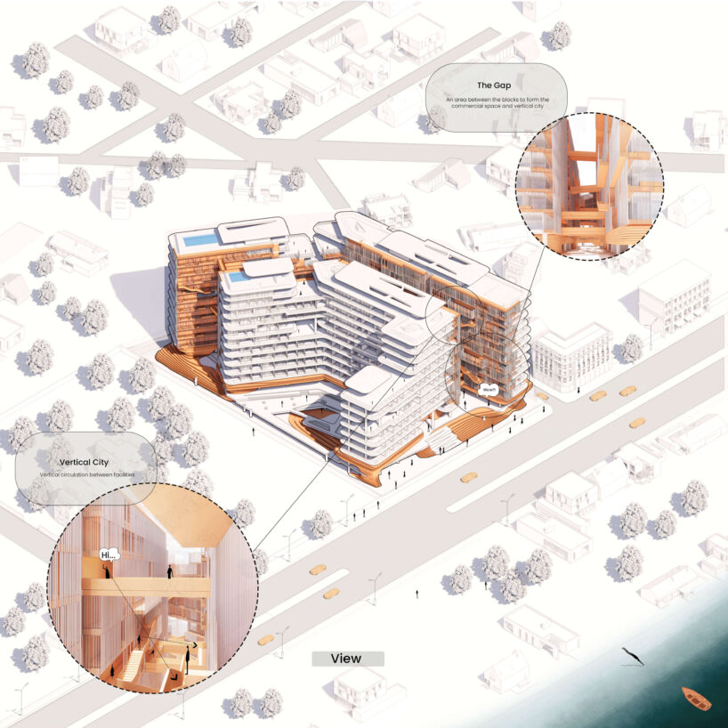 The design by Shabahang Architecture Office fosters a dynamic interaction between the residents and the city. The commercial spaces, integrated at the base, provide amenities that are accessible both to residents and the public, allowing the building to contribute to the urban experience. At the same time, the open passage and inner courtyards allow for ventilation and a degree of openness, providing a contrast to the more enclosed volumes of the surrounding development. The project aims to challenge the traditional rigid boundaries seen in typical Caspian coast developments by inviting the city into the building, while maintaining privacy for the residents. The open nature of the design contrasts with the more common isolated structures, offering a space that is both welcoming and conducive to interaction.