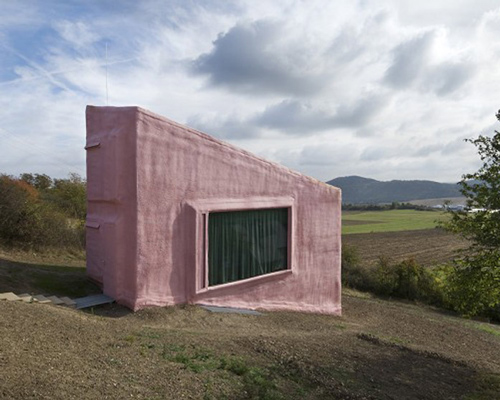 ‘vila hermina’ by HSH architects is situated on a sloping terrain on the outskirts of cernín, prague. the same slope is used internally for the floors, with the interior layout based on alternating straight and inclined floors. these surfaces create the overall spiraling character of the interior, and define the building’s external appearance. the sloping platforms are also able to accommodate movie projections. windows and other openings are placed with respect of the external facade, while each of the walls has only one opening. for thermal and water insulation, a polyurethane spray with a pink finish has been used as an homage to ‘versuchsanstalt fur wasserbau und schiffbau’ by ludwig leo.