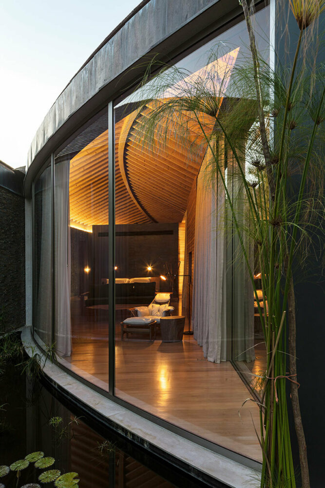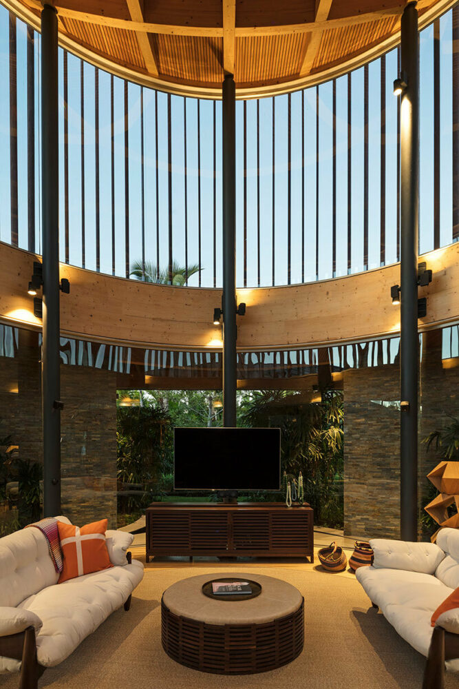 Casa Punta Cana by Mareines Arquitetura (see more here) is inhabited by an American family who took part in all stages of the design. Requesting a comfortable and large house sprawled across one level with several rooms of the same size, the clients adorned their spaces with decoration and furniture by Brazilian designers, with the exception of one chair. In the north block are six independent suites, each one with its own view and gardens. The south block houses the dining room, bar, kitchen, game room, gym, and all related services. In the center, a common room is planned as a meeting place for family members to gather, as well as guests, all coming from abroad. In addition to a glass cylinder floating amidst the water gardens, the entire residence is snaked lengthwise by a large veranda. A total of 700 sqm of open and closed patterns take over Casa Punta Cana, with highs and lows, varied shapes, and landscapes in all directions.