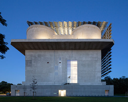 the hamburg-wilhelmsburg flak bunker was built in 1942 and was in use for the following four years, built as a stronghold equipped with anti-aircraft turrets designed to withstand attacks from the ground or the air during world war 2. local studio iba-hamburg was commissioned to turn the icon into a useful structure for the current day and age. now restored as a public memorial complete with four 30 meter tall towers and an impenetrable concrete envelope, the fortress now serves as the surrounding residential area’s renewable energy supply providing heat and power from 85% renewable resources. a steel framing system separated from the faces of the southern wall and roof serve as a substructure for large louvered solar panel strips that output over 100kW per week. at the heart of the bunker, a large storage facility stores up to 2 million liters of water, made in a chamber that was the result of internal explosions triggered at the end of the war. in other rooms, heat is generated through industrial waste, a biomethane gas-driven heat and power unit, and a wood combustion system. in the location of one of the aircraft turrets, 30 meters above the ground, a new cafe has been opened to host the various visitors from around the world.