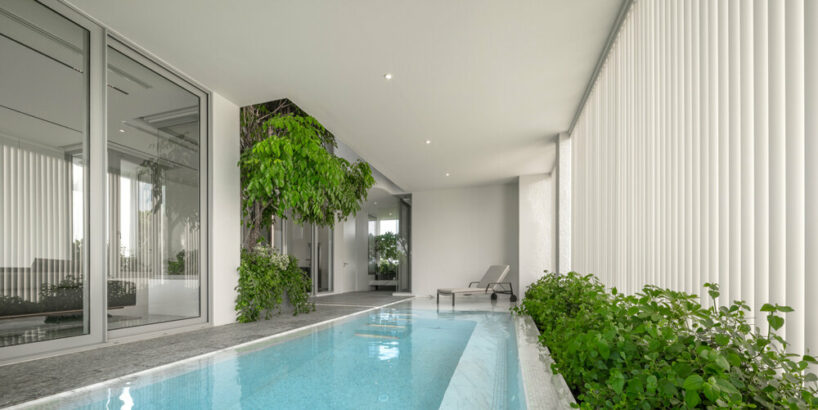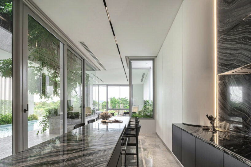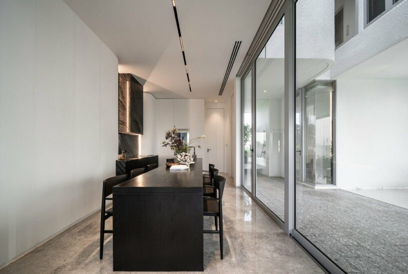 the project sits like a ring placed over the terrain, with its funnel-like roof forming a shaded perimeter walkway and an introverted core.