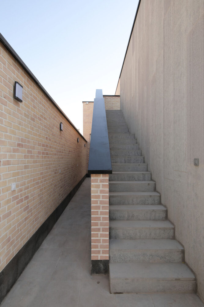 The entrance leads to a western path that opens into a cozy courtyard, where the house’s main entry is located. This path, along with the staircase, forms a continuous design element that connects the exterior and interior spaces. The architects ensure privacy by orienting the entrance away from the public areas. A partition wall creates a clear separation between the entrance and the rest of the house, delineating public and private zones.