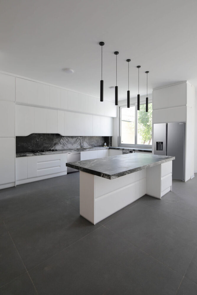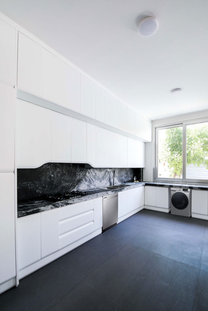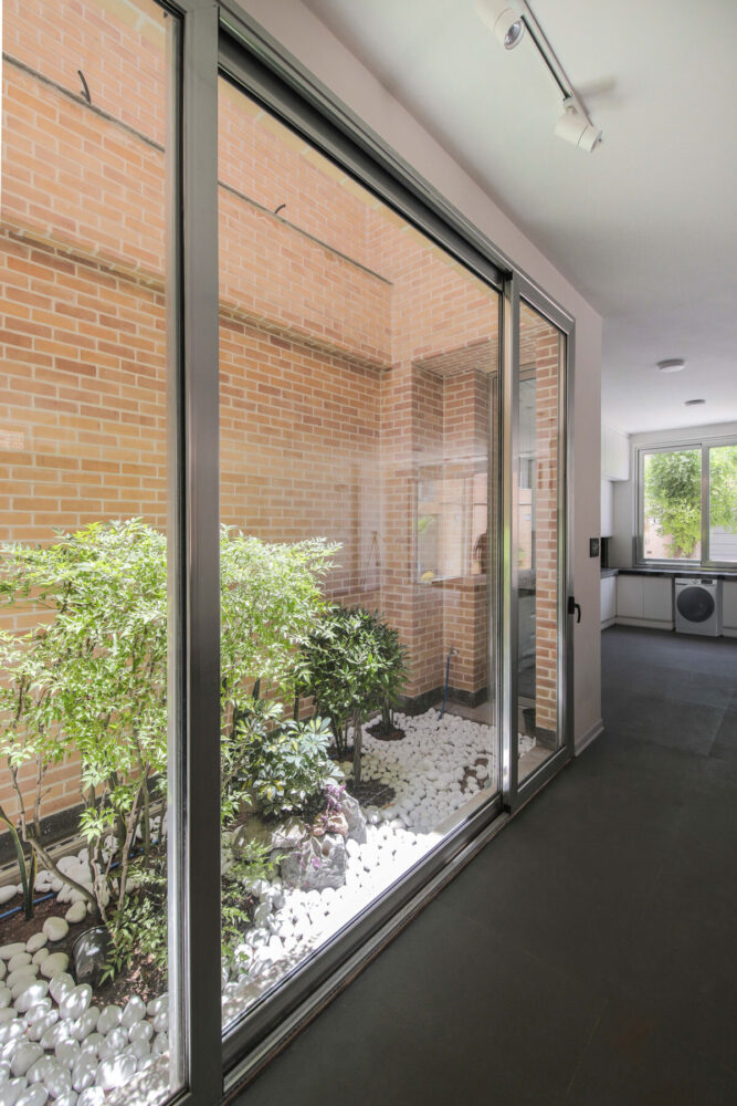 the kitchen and living spaces open to the southern courtyard, maximizing natural light