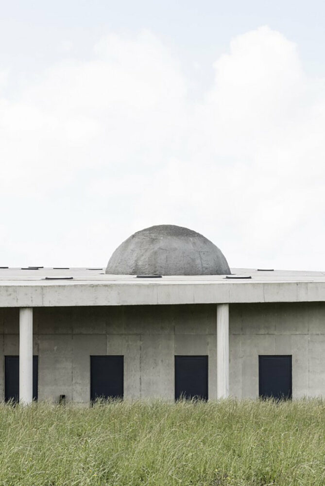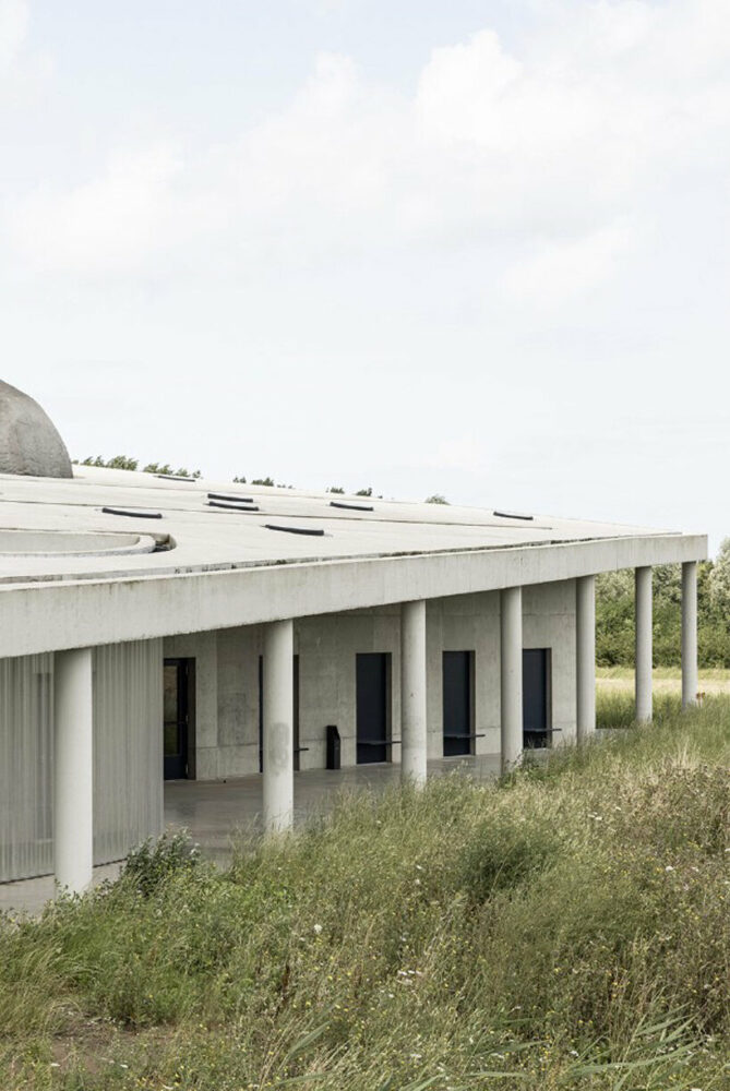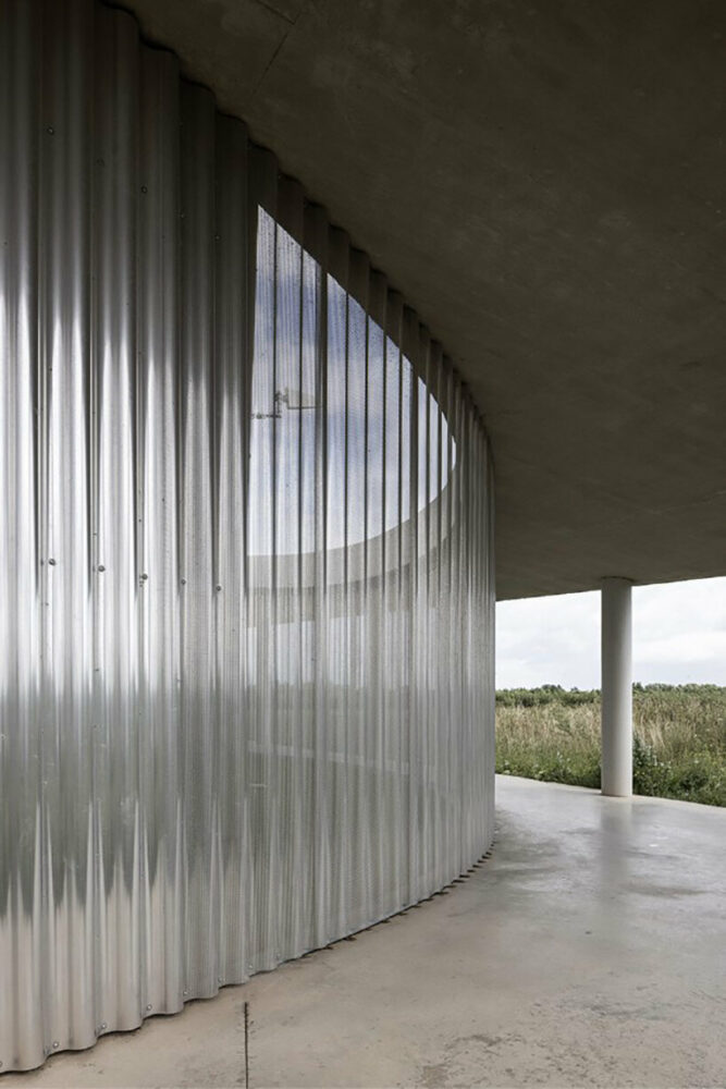 the project sits like a ring placed over the terrain, with its funnel-like roof forming a shaded perimeter walkway and an introverted core.