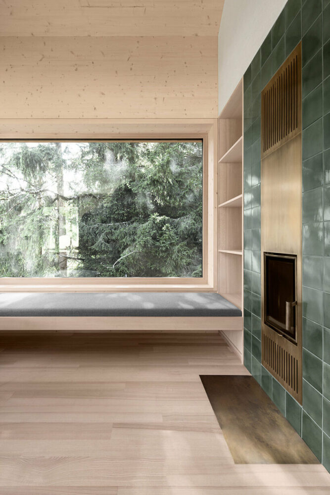 The small house by Innauer Matt Architects (find more here) stands secluded, away from other buildings, offering residents the opportunity to enjoy peace and quiet amidst the scenic landscape. High mountains and lush trees envelop the timber cabin, which stands out from the green surroundings due to its materiality.