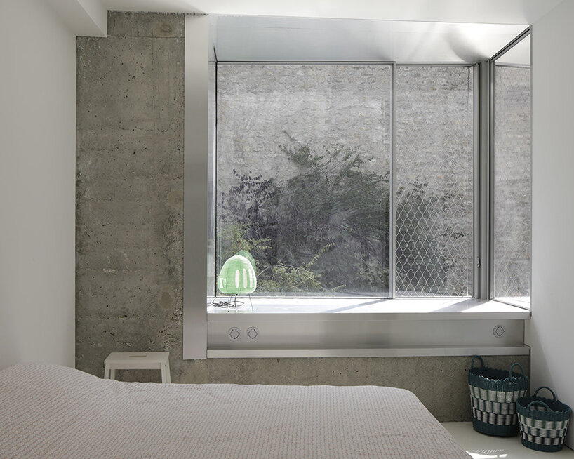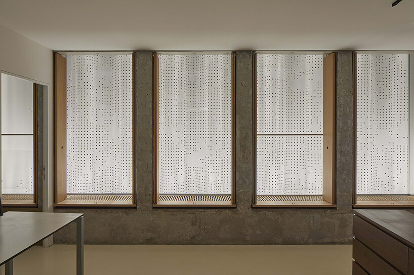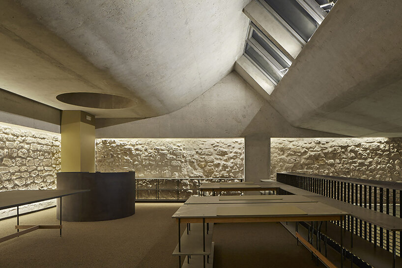 the project sits like a ring placed over the terrain, with its funnel-like roof forming a shaded perimeter walkway and an introverted core.