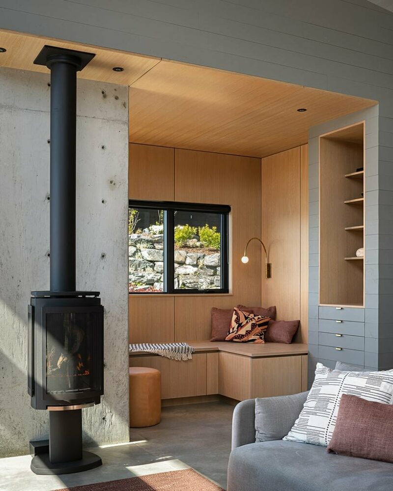 The geometry is defined by two tall shed roof structures with a connecting corridor between them. The joining formation serves as the home’s main entrance, linking the private and public spaces with an outdoor deck. The eastern side of the property is kept mostly opaque by tree coverage and minimal openings to create a sense of seclusion from neighbors. Along the west side of the home, the master bedroom and living room extend as cantilevers over the rock wall below, giving a sense of floating above the water. Floor-to-ceiling glazed windows allow unobstructed views of the landscape and give the interior spaces an outward directionality. A secondary set of lower shed roof volumes within the main building wings shape a seating nook by the living room and a laundry area near the guest bedroom.