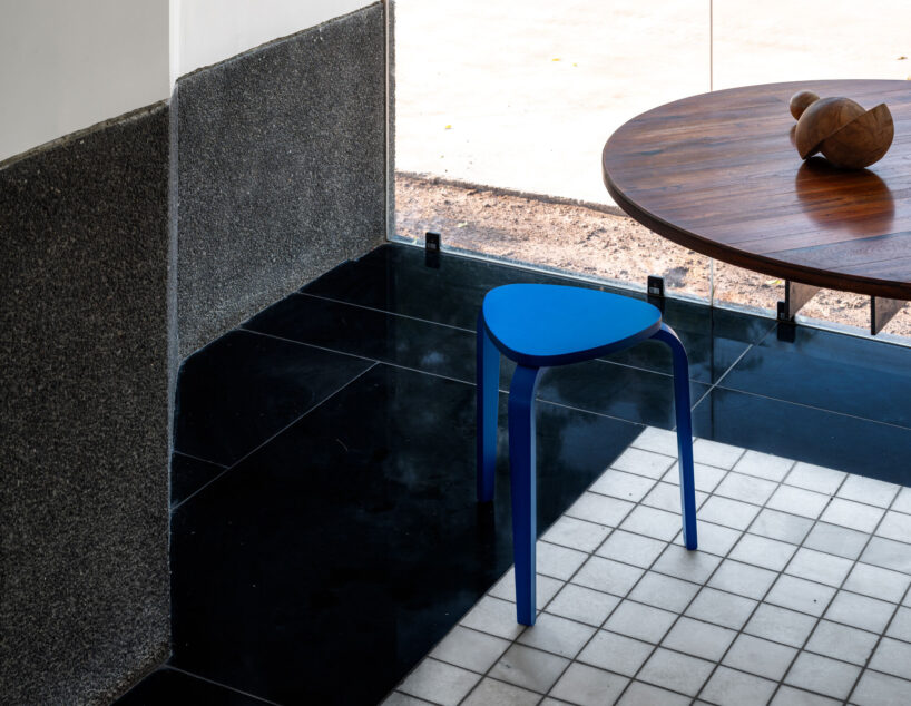 the project sits like a ring placed over the terrain, with its funnel-like roof forming a shaded perimeter walkway and an introverted core.