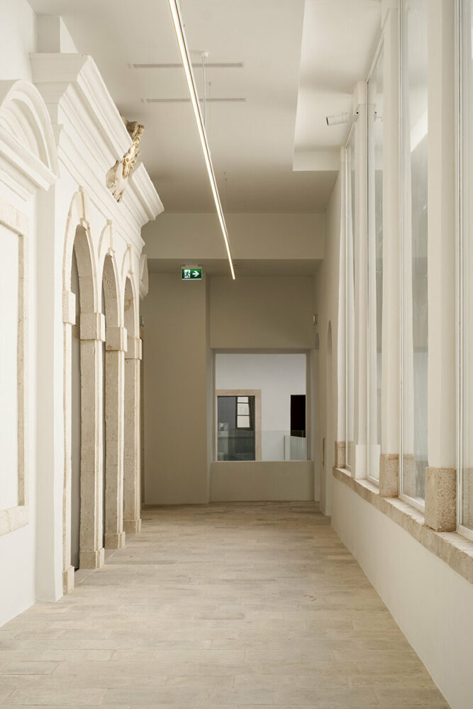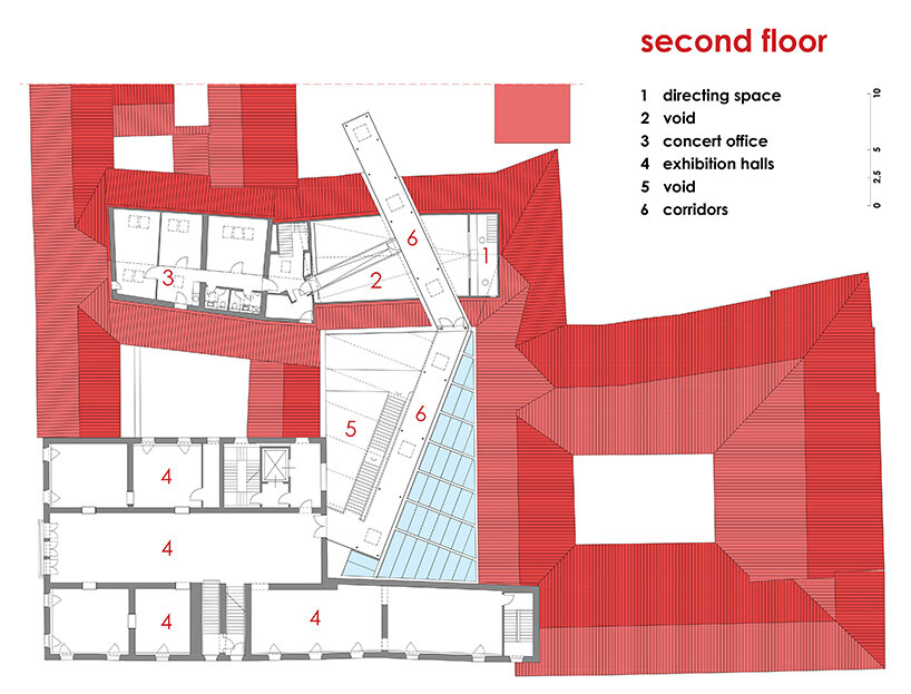 the project sits like a ring placed over the terrain, with its funnel-like roof forming a shaded perimeter walkway and an introverted core.