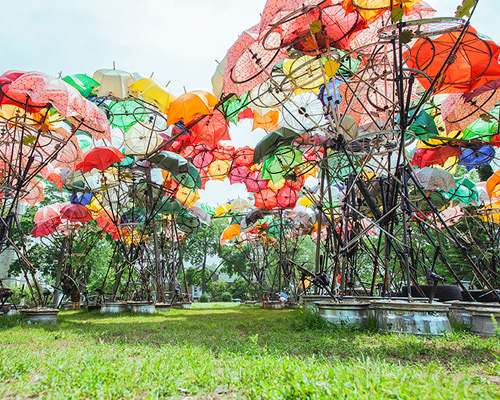 as outlined in their original concept, the ‘city of dreams pavilion’ was realized with only recycled materials. broken umbrellas, old stools, wrecked bicycle and car rims are the primary components; sourced from several institution within the greater new york area. after dismantling, it is proposed that all elements will be reused in various situations, albeit not as a whole. individual, self-sufficient units can be pulled from the pavilion and take on a slew of different functions. the ‘city of dreams pavilion’ was built by izaskun chinchilla architects with help from volunteers, FIGMENT, the emerging new york architects committee, and the structural engineers association of new york. it is on display on governors island in new york city, new york.