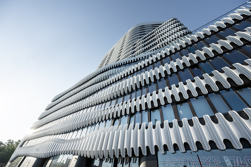 the project sits like a ring placed over the terrain, with its funnel-like roof forming a shaded perimeter walkway and an introverted core.