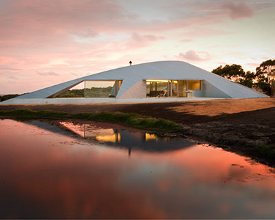 upon the expectations of the owners for a residence that allows a ‘full outlook to and shelter from the coastal vistas in all directions’ and to be ‘part of the landscape’, australian architect james stockwell designed the crescent-shaped croft house along the south coast of victoria. emerging subtly from the exposed landscape, the semi-circular footprint simultaneously opens panoramic views to the sea while cradling a protected outdoor courtyard from the strong prevailing winds. locally-sourced materials of low embodied energies illustrates a contemporary step in the regional history with traditional craftsmanship. the smoothed concrete exterior envelope resonates with the shale geology, warmed internally by compressed sand thermal walls like sand dunes. the rich timber interior is comprised of vic ash and bluestone coming from locally-sourced origins. double glazing and isolated thermal mass make for an energy efficient home with a naturally high fire rating. the fluid roof system is built up of two-dimensional planes constructed with battens, rafters, and corrugated metal – in line with local conventional regional construction methods.