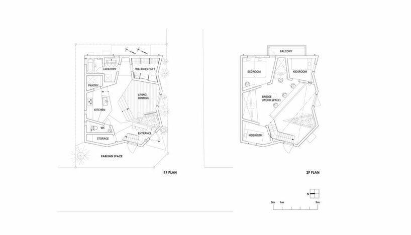 On the upper level, private rooms are connected by a bridge which is wide enough that it can be used as a workspace or hobby area. ‘It seems that you can use it as if it were a second living room, because you can feel the connection with the entire family in terms of cross section,’ notes Airhouse.