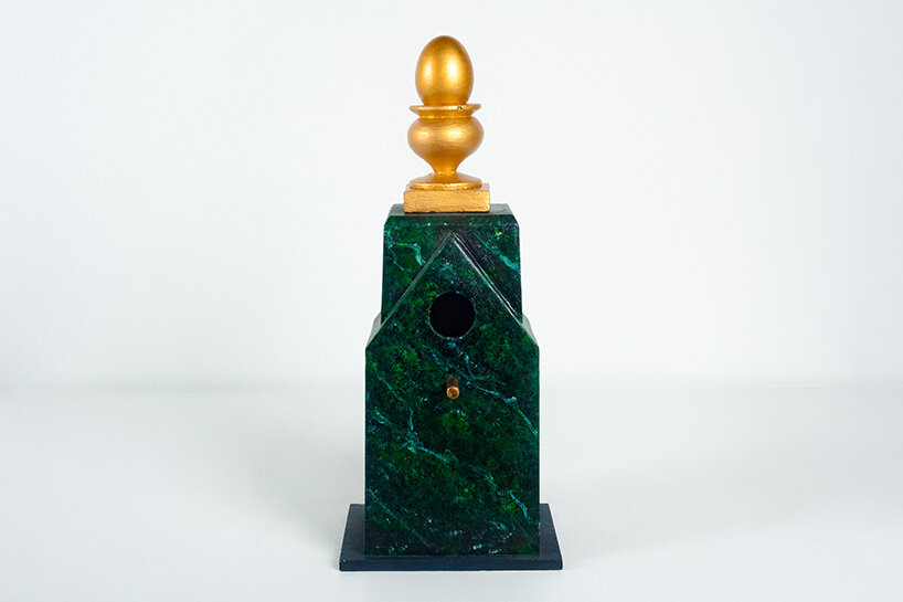 The Atlanta Birdhouse | a green marbleized birdhouse & plinth with gilt egg cup & chicken egg toper, 14” x 6” x 1/4”