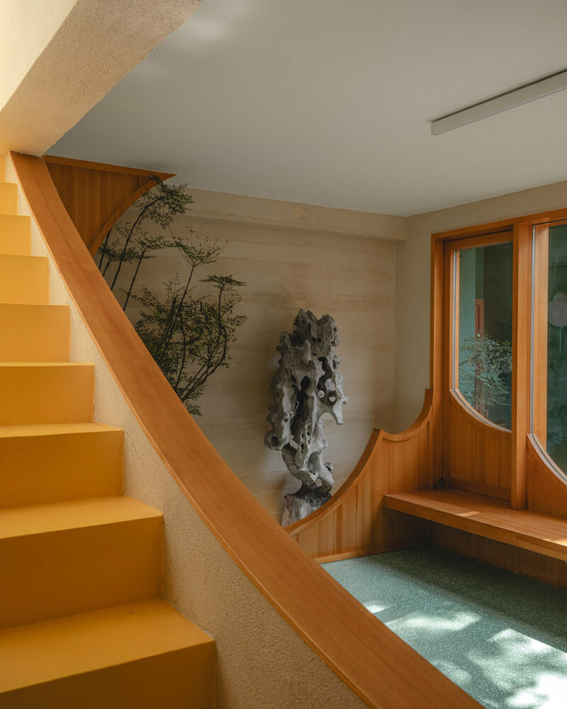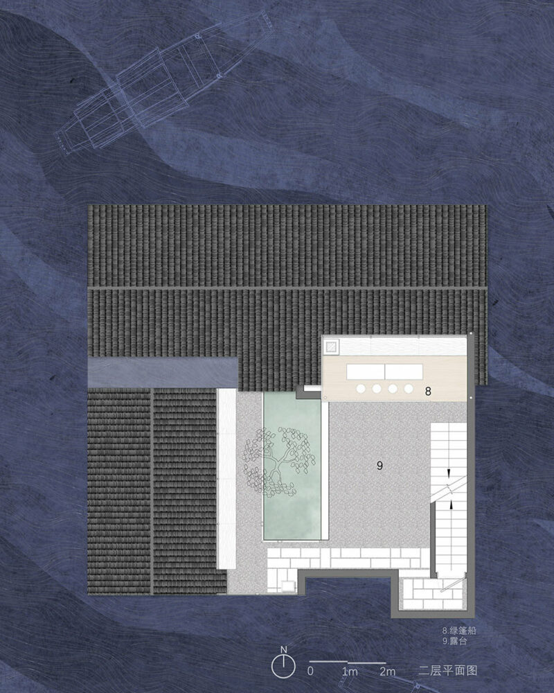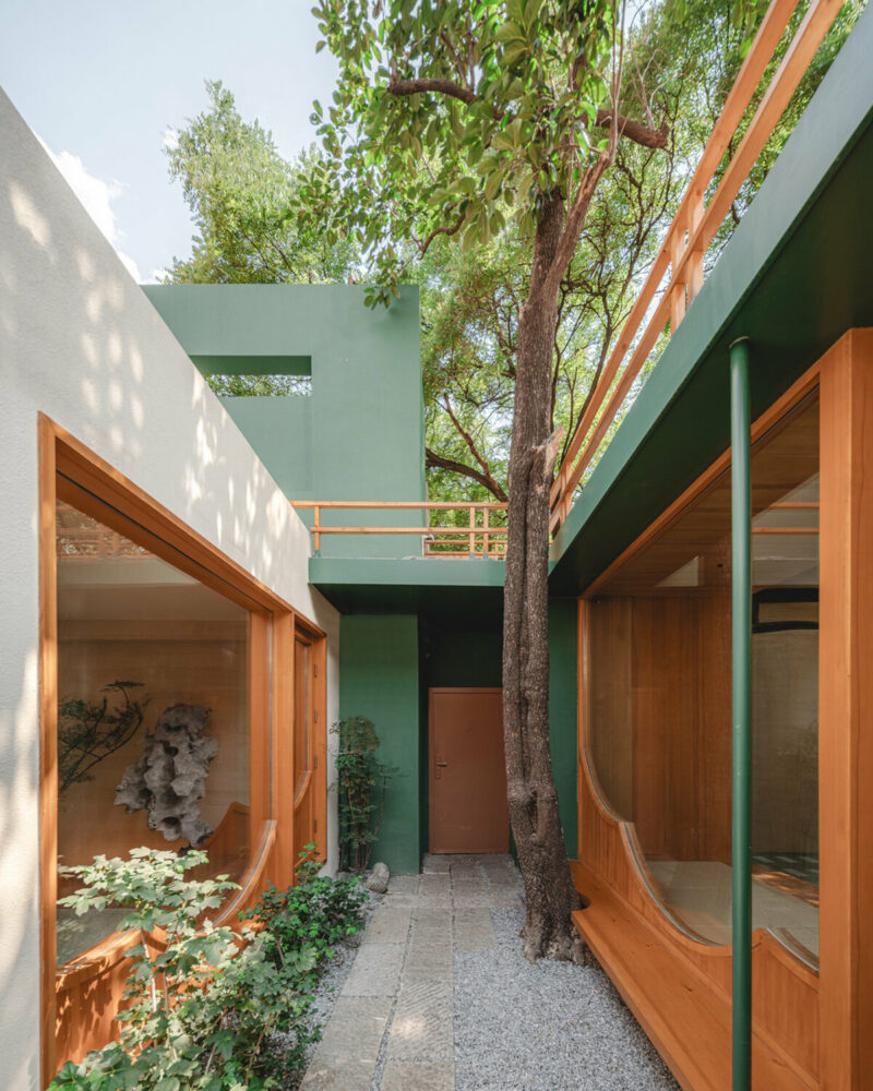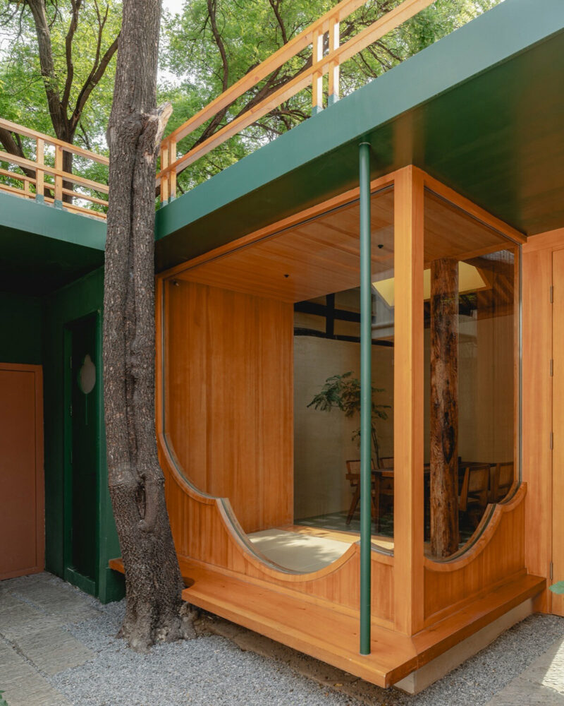 the green-canopied boat on the second-floor terrace resembles a ship, creating a tea pavilion space